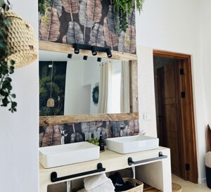 bathroom, and a spectacular shower. The large windows offer stunning views of the pool area, making every morning unique.